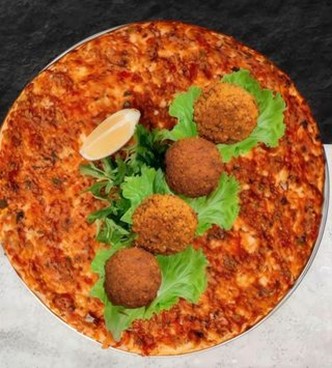 Pizza turca, croquetas de garbanzos, lechuga, tomate, cebolla, zanahoria y salsas